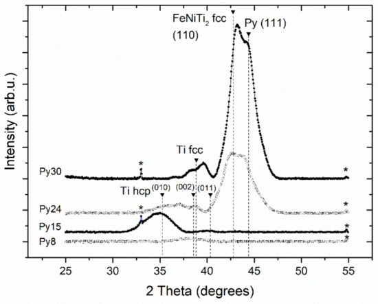 For tPy above 24 Å, secondary Laue oscillations are visible on the low-angle side of the main Bragg peak associated with both crystalline FeNiTi2 and Py. The appearance of these peaks around the Py peak indicates a good reproducibility of its crystalline structure along the multilayer. Observing the Laue oscillations on the low-angle side and not on the high-angle side indicates that the separation of crystalline planes has expanded at the interfaces with regard to the center of the layers [24]. Such spacing differences can be explained by the interstitial diffusion of Ti in Py at the interfaces during the sputtering process [25,26]. This causes the expansion of the lattice at the Py-Ti interface, where FeNiTi2 is created. This effect created by the diffusion of Ti has been previously reported in similar systems such as Ti/Fe [23] and Ti/Ni [24].