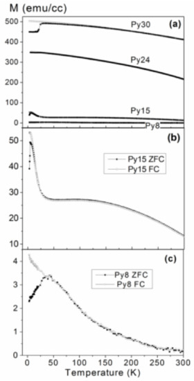 Figure 3 displays ZFC and FC magnetization curves of all the samples. As can be observed in Figure 2a, the thickest samples (Py24 and Py30) exhibit the typical shape for ferromagnetic (FM) materials (with the magnetization gently decreasing as the temperature increases) but with a certain splitting of the ZFC and FC curves at low temperature.