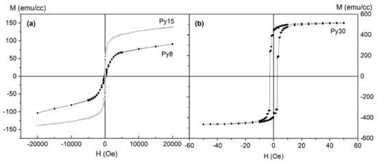 Figure 4 shows selected hysteresis loops measured at 5 K. In particular, the loops corresponding to the samples Py8 and Py15 are shown in Figure 4a. As can be observed in both cases, the loops do not saturate even at fields as high as 20 kOe, which is consistent with the presence of a SPM phase, as evidenced by the previous results. Meanwhile, in the case of the thicker samples, the hysteresis loop reaches saturation at very low fields, as could be expected for a continuous FM magnetic layer (as can be observed, e.g., for the sample Py30 in Figure 3b, where the contribution of SPM NPs is negligible compared to the ferromagnetism of the continuous Py layer).