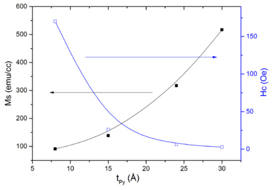It is also noteworthy the evolution of the saturation magnetization at 5 K, Ms, (in the case of the Py8 and Py15, the magnetization at 20 kOe) and of the coercive field, Hc, versus the nominal thickness of the Py layer-tPy (see Figure 5). In particular, Ms decreases as the thickness is reduced but it does not disappear, as is usually assumed with a dead layer model [14]. In fact, what we observed is not a totally dead layer but instead a granular alloy of Ti and Py NPs, giving place to the SPM behavior observed in the thinner samples. On the other hand, the coercive field decreases as the thickness increases. This can explain what we have found previously: in the thickest samples, we have a continuous and thick Py layer, behaving as a soft material. For the Py15 sample, in addition to a continuous Py layer, we also have blocked SPM NPs in the alloy layer, therefore increasing the coercivity. In the Py8 sample, we have only blocked SPM NPs, and the coercive field is even higher.