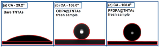 Contact angles of bare TNTA and after functionalization with self-assembled monolayers (SAMs): (a) bare TNTAs (b) freshly prepared ODPA@TNTAs, and (c) freshly prepared PFDPA@TNTAs.