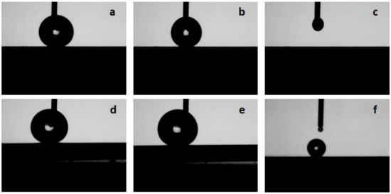 Typical snapshots of the water droplets obtained in the determination of advancing and receding contact angle (CA): (a) and (d) expanding droplets, (b) and (e) contracting droplets, and (c) and (d) wetting as water recedes into the syringe for (a–c) PFDPA@TNTA and (d–f) ODPA@TNTA samples.
