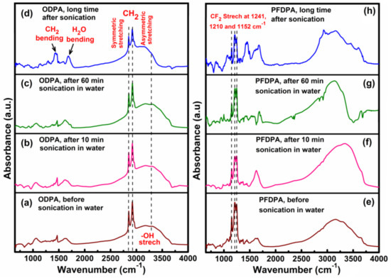 Diffuse reflectance Fourier transform infrared spectroscopy (DRIFTS) spectra of the as-prepared TNTAs functionalized with ODPA and PFDPA and after ultrasonication in water: (a–d) ODPA@TNTA, and (e–h) PFDPA@TNTAs; (a) and (e) as prepared or before ultrasonication, (b) and (f) after 10 min ultrasonication, (c) and (g) after additional 60 min ultrasonication, and (d) and (h) sonicated samples after storing overnight in the ambient.