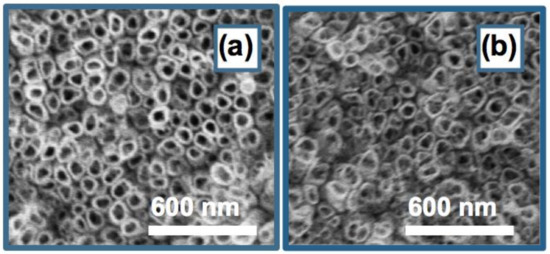 FESEM images of (a) ODPA@TNTA and (b) PFDPA@TNTA recorded after intense cavitation by ultrasonication in water for 10 min followed by additional 60 min.