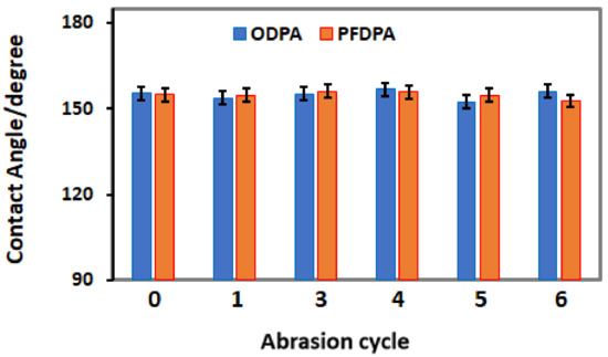 CA versus number of abrasion cycles: ODPA@TNTA (blue bar) and PFDPA@TNTA (orange bar) samples. An abrasion cycle consists of pushing the sample with 50 g weight on it through a 320-grit sand paper for a distance of 5 cm. The CA was measured at the end of each cycle.