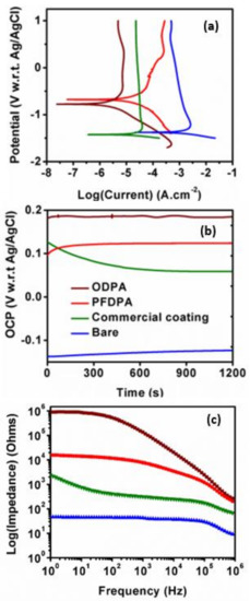 The resistance of the samples to corrosion was performed in 3.5 wt. % NaCl in three-electrode setup. Figure 8a shows the Tafel plots, wherein higher Ecorr values can be observed for ODPA and PFDPA SAMs than for the bare TNTAs and commercial coating incorporated TNTAs. Insulation due to the SAM and coating is reflected in the increased resistance of these samples compared to bare TNTA sample. Evolution of open circuit potential (OCP) with time is shown in Figure 8b, and it reveals similar trend as Tafel curves (in Figure 8a). Polarization resistance (Rp) of the SAMs was calculated using Equation (1) [59], in which B is a constant related to Tafel constants (anodic, βa, and cathodic βc) by Equation (2). Icorr is the corrosion current, which is obtained at the intersection of Tafel slopes. Values of βa, βc, Ecorr, Icorr, and Rp are listed in Table 1.