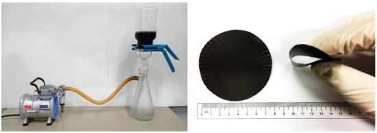 MWCNTs and GNPs have strong tendencies to form bundles and aggregate together because of their high surface area and the strong van der Waals interaction. They are also hydrophobic and have poor solubility in aqueous solutions []. In this study, the MWCNT/GNP hybrid films were prepared with the aid of surfactant Triton X-100. The molecular structure of surfactant Triton X-100 (Big Sun Chemical Corp., New Taipei City, Taiwan) contains a hydrophilic polyethylene oxide group and hydrocarbon lipophilic (or hydrophobic group), which improves the dispersibility of MWCNTs and GNPs in aqueous solution []. The hybrid films with different weight ratios of MWCNT and GNP were prepared using the following process. The total mass of MWCNTs and GNPs was held constant at 0.16 g. Surfactant Triton X-100 with the weight of 5 g were dissolved in 500 ml deionized water and dispersed by a sonicate tip (Q700, Qsonica L.L.C., Newtown, CT, USA) for 30 min at 30 W. The sonicator was operated at pulse mode (10 s on and 20 s off). Then, a total mass 0.16 g of MWCNTs and GNPs with a desired weight ratio were added to the suspension and dispersed by a sonicate tip for 3h at 30 W. Upon completion of the dispersion process, the MWCNT/GNP suspension was filtered through a Polytetrafluoroethylene (PTFE) microporous membrane (pore size 0.45 μm, diameter 90 mm) by a vacuum filtration. The experimental setup of the vacuum filtration is shown in Figure 1. After filtration, the hybrid film was peeled off from the filter membrane and washed by a large amount of isopropyl alcohol to remove any residual surfactant. The film was dried in a vacuum oven preheated to 40 °C for 12h. The typical thickness of the hybrid film was 60–80 μm. Following the same process, a series of hybrid films with GNP weight percentage ranging from 0 wt.% to 50 wt.% were fabricated to investigate the effect of GNP on the mechanical and electrical properties. In this study, hybrid films with GNP weight percentages of 0%, 10%, 20%, 30%, 40% and 50% were denoted as GNP-0, GNP-10, GNP-20, GNP-30, GNP-40 and GNP-50, respectively.