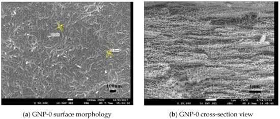 Since the discoveries of carbon nanotubes (CNT) by Iijima [] and graphene nanoplatelets (GNP) by Novoselov et al. [], they have received a great attention as raw materials for the development of nanomaterials due to their excellent thermal, electrical and mechanical properties, low density and high specific surface area []. Nowadays, enormous efforts have been devoted to the use of CNT and graphene in various applications, such as energy storage [,], field effect transistors (FETs) [], electrodes [,] and sensors [,]. Thin films or paper-like materials consisting of GNP or CNT have drawn extensive attention and they are being widely employed for supercapacitors [], pressure sensors [], monitoring cure behavior of polymer composite [], flexible temperature sensors [], and as reinforcing fillers in polymers [,,]. These free-standing thin films are cohesively bound by van der Waals interactions among entangled CNTs and GNPs. The main idea behind the fabrication of thin film is to utilize the excellent properties of individual GNP and CNT in macroscopic form. This thin film is advantageous to facilitate easier handling of GNPs and CNTs and to improve the capability of using GNPs and CNTs in industry []. These thin films are suitable for both lightweight structural and functional applications.