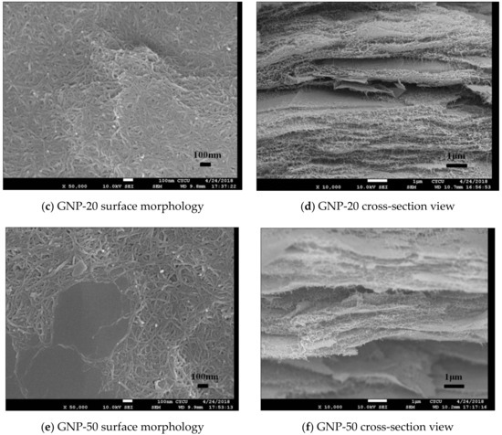 A typical MWCNT/GNP hybrid film is shown in Figure 1 It can be seen that the film is highly flexible, which can be rolled up or bear small radius bending without any damage or fracture. The surface morphology and cross-section view of the hybrid film with 0 wt.% (GNP-0), 20 wt.% (GNP-20) and 50 wt.% (GNP-50) of GNP are presented in Figure 2. The surface morphology of the film GNP-0 (0 wt.% GNP and 100 wt.% MWCNT) exhibits homogenous and densely packed mass of randomly oriented MWCNTs without any agglomeration, and this orientation gives rise to its isotropic properties as shown in Figure 2a. For the hybrid film GNP-20 (20 wt.% GNP and 80 wt.% MWCNT), most of the GNPs are covered by the MWCNTs as shown in Figure 2c. As the content of GNP increases, some of the GNPs can be observed on the top of MWCNTs as shown in Figure 2e for hybrid film GNP-50 (50 wt.% GNP and 50 wt.% MWCNT). GNPs and MWCNTs are uniformly dispersed and highly entangled with each other. From the cross-section SEM images shown in Figure 2b,d and f, MWCNTs and GNPs are successfully deposited to form densely packed film with layered structure. Similar layered structure with MWCNTs distributed between GNP sheets in the flexible GNP/MWCNT film using as a high performance supercapacitor was also reported by Lu et al. []. It can be attributed to the filtration-induced directional flow during the fabrication process. Under the vacuum filtration pressure, the 2D GNP tended to self-adjust their basal planes parallel to the filter membrane plane due to the large aspect ratio of GNP sheets, resulting in significant alignment of GNP sheets []. Clearly, GNP sheets served as the supporters to hold the MWCNTs in-between, generating a more compact and aligned structure of hybrid films. Graphene sheets uniformly spread on MWCNTs and alternately stacked layer structure are observed. With the increase of GNP content, the long and tortuous MWCNTs are embedded between the GNP layers, which can prevent the aggregation of GNPs. It appears that MWCNTs were preferentially oriented and bridged the gap between the GNP layers.