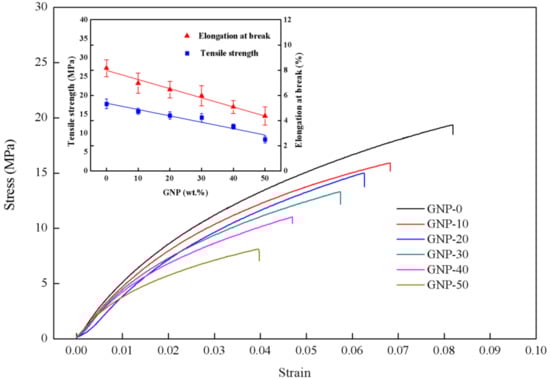 Stress-strain curves of the hybrid films with different weight percentage of graphene nanoplatelets (GNP).