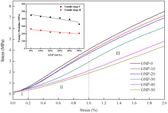 The enlarged stress–strain curves as shown in Figure 4 can be divided into three stages. In stage I (strain ranging from 0 to 0.2%), the wavy MWCNTs are first straightened upon tensile loading, causing little change in stress with linear stress-strain relationship []. In stage II (strain ranging from 0.2 to 1.0%), the deformation happens under fairly law stress and the joints between MWCNTs and GNPs inside the film are stretched resulting in a higher elastic modulus which is analogized to the disentanglement of polymer chain []. In stage III (strain >1.0%), with further stretching of the hybrid film, interlock between GNPs and MWCNTs gradually fails and the network becomes loosely, a non-linear stress-strain relationship is observed. At the initial stage of loading, significant straightening took place both in the GNPs [] and MWCNTs leading to alignment along the tensile direction, after which the curves became almost linear at higher strains. Elastic moduli of the hybrid films in stages I and II of the tensile testing are shown in the inset of Figure 4. The elastic modulus of the hybrid film in stage II is higher than that of stage I by approximately 200 MPa. It appears that GNPs were easier to be straightened due to the slippage of the overlapped GNPs; i.e., it is more flexible than MWCNTs which were interlocked with each other. The tensile strength and Young’s modulus of the hybrid film measured as a function of GNP content are shown in Figure 3 and Figure 4, respectively. Both properties consistently increased with decreasing GNP content, indicating the dominance of MWCNT on mechanical properties of the hybrid film.