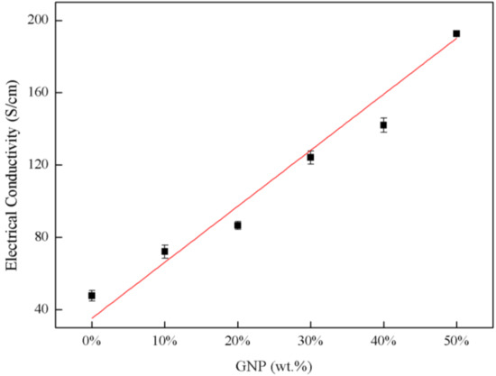 Table 2 lists the electrical resistivity and conductivity of the hybrid film with different weight percentages of GNP. It can be seen that the conductivity of the hybrid film is increasing with the increase of the content of GNP as shown in Figure 5. While both MWCNTs and GNPs are highly conductive, GNPs are more conductive for two reasons. Firstly, their two-dimensional nature results in a better connectivity and so a greater choice of conductive paths for electrons to flow through. Secondly, their planar nature allows them to pack more closely than MWCNTs, giving lower porosity []. Thus, GNP is the dominant factor on the electrical property of the hybrid film. A remarkable increase in the electrical conductivity from 47.72 S/cm to 192.60 S/cm was observed when the GNP content was increased from 0 to 50 wt.%. The conductivity of the hybrid film GNP-50 was enhanced by 304% in comparison with the GNP-0, due to the formation of 3D conductive networks []. The hybrid film exhibits a well-stacked layered structure throughout the cross section. The MWCNT network bridges the gap between the GNPs. Larger lateral dimension of GNP acts as a strong holder while MWCNT serves as a wire to connect GNP. The conductivity of the hybrid film depends on the conductive network formed by the MWCNTs and the inherent conductivity of GNPs. At a low weight fraction of GNP, MWCNT and GNP are not close-packed to form effective conductive pathways in the hybrid film. The overlap of MWCNTs introduces larger interfacial resistance that further decreases the conductivity of the hybrid film with too much MWCNTs in the grapheme layer. When the fractions of GNPs were increased, the percolated network of MWCNTs and GNPs was formed which provided efficiently conductive pathways for electron transfer in the hybrid film. The decrease in the sheet resistivity by incorporation of GNPs demonstrates that two-dimensional GNPs provide a more efficient percolating network than one-dimensional MWCNTs. Furthermore, GNP worked as strong holders with a large surface area to support contact between the MWCNT and GNP, resulting in a further reduction of the contact resistance. In the MWCNT-dominated hybrid film, a pronounced synergistic effect on conductivity can be observed. The electrical conductivity is related to both in-plane and through-thickness conduction of electrons. It is clear to see from Figure 2 that 1-D MWCNTs act as bridges to connect 2-D GNPs and provide additional channels for the electron transfer within the hybrid film. This leads to a decreased electrical resistance and may be considered as the major reason for the synergistic effect of the MWCNT and GNP hybrid films. In addition, high electrical conductivity of GNP in the basal plane enhances the synergistic effect on electrical conductivity.