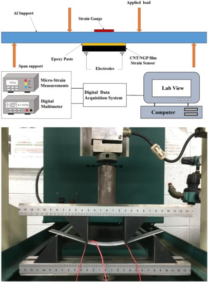 The prepared hybrid film was cut into a rectangular strip (30 × 10 mm) for evaluation of the piezoresistive response and sensing performance. The strain-monitoring capability of the hybrid film sensor was tested in a flexural test. Electrical resistance and mechanical strain during the test were measured simultaneously by a digital Multimeter (Keithley 2450) and strain gauge, respectively. The hybrid film sensor was attached to the center of an Al (Al6064-T6) test specimen (dimensions: 200 × 19 × 2 mm) using epoxy to make perfect bonding between the specimen and hybrid film sensor. When the load was applied on the Al specimen, the hybrid film bonded through high strength epoxy and the metallic strain gauge experienced the same strain. Two copper electrodes were adhered to the hybrid film sensor at a distance of 25 mm using silver paste to minimize the contact resistance. The electrical resistance in monitoring tests was measured by the two-point method due to the simplicity of the method regarding scalability to real applications []. Resistivity and strain data were recorded by the digital data acquisition system (cDAQ-9174 NI) through the Lab VIEW software. In this work, a four-point-bending test was conducted to study the piezoresistive behavior of the hybrid film sensor. The spans between the two inner points and two outer points are 60 mm and 120 mm, respectively. A schematic diagram and experimental setup of the four-point-bending test are shown in Figure 6.