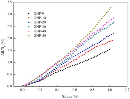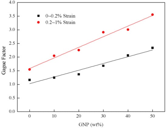 The addition of GNPs increases the conductivity of the hybrid film as described in Section 3.2. Four-point-bending tests were performed to monitor the electrical resistance change of the hybrid film with different GNP contents induced by the strain. Gauge factor is an important parameter which can be used to describe the sensitivity of the strain sensor. It is defined as the ratio of the normalized electrical resistance and strain induced in the sensor as follows.