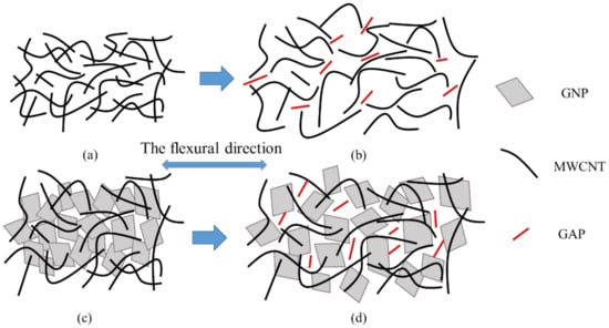 Schematic representation of microstructure changes in hybrid films subjected to mechanical strain. (a) MWCNT film; (b) Stretching of MWCNT film under flexural strain; (c) MWCNT/GNP hybrid film; (d) Stretching of MWCNT/GNP hybrid film under flexural strain.