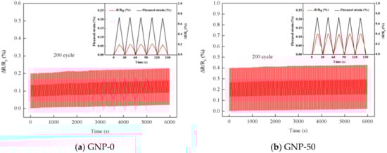 To investigate the stability, reversibility and reliability of the hybrid film sensor, the specimens were subjected to 200 cyclic loading–unloading tests. This test aimed to monitor the electric resistance response of the hybrid film under cyclic loading. The dynamic responses of the normalized resistance change and mechanical strain of hybrid films with 0 wt.% (GNP-0) and 50 wt.% (GNP-50) of GNP are plotted in Figure 10a,b, respectively. It can be observed that there is no obvious change during the 200 cycling tests for the hybrid film sensors. This demonstrates that the high durability and stability of the hybrid film sensor. Some researchers [,] also did the cycle loading–unloading tests for stability of the GNP/epoxy sensors, they are stable under certain cycles, but the cycles they tested were as low as 50 or even several cycles.