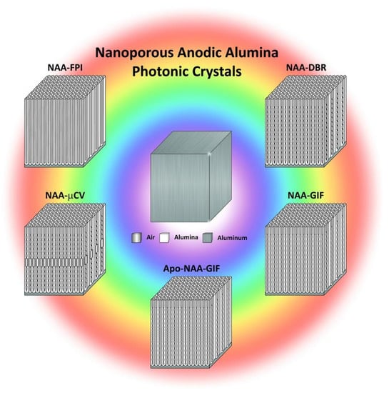 Photonic crystals (PCs) are a type of optical materials that mold the flow of electromagnetic waves by multiple Bragg scattered interferences defined by Bloch modes [,,]. Light propagation in PCs can be controlled with precision by engineering the structural features of the PCs in a multidimensional fashion (i.e., 1D, 2D, or 3D). Nanoporous PCs are particularly good candidates to develop ultra-sensitive optical sensing platforms since they provide (i) light-modifying capabilities to alter and engineer the flow of photons at specific broadband spectral regions (i.e., from UV to IR), (ii) a nanoporous structure that facilitates mass transport of molecular species involved in binding events, and (iii) high specific surface area that increases the number of functional binding sites within the optical platform []. Furthermore, nanoporous PCs can be produced by a range of cost-competitive, fully scalable self-organization approaches that provide excellent control over the PC’s features at the nanoscale. For example, inverted opal structures produced by a combination of self-organization of silica nanospheres and deposition of oxides or metals are one of the most representative types of nanoporous PCs [,]. However, these nanostructures have limited versatility to tune the photonic stopband (PSB) of PCs, are restricted to 3D nanostructures, feature defects that act as light scattering centers, require long synthesis processes (>24 h), and are constrained to small areas (mm2–cm2) []. Another prime example of nanoporous PC platform material is porous silicon (pSi), which is typically produced by electrochemical etching of silicon in hydrofluoric acid (HF)-based electrolytes [,,]. Although, pSi presents excellent optoelectronic properties to develop optical sensing systems, its practical application is limited by its poor chemical stability without additional passivation steps, its fragile mechanical strength, and its fabrication process, which requires the use of extremely hazardous HF-based electrolytes [,]. Among other alternatives, nanoporous anodic alumina photonic crystals (NAA-PCs) produced by electrochemical oxidation (i.e., anodization) of aluminum—an industrially scalable and low-cost nanofabrication approach used in industry for decades—has been devised as an excellent alternative/complementary platform material to develop optical sensing systems in combination with a broad range of photonic technologies []. The nanoporous structure of NAA can be engineered by means of different anodization approaches to produce PC structures with finely tuned optical properties across the spectral regions. NAA provides controllable and versatile nanopore geometry, chemical and physical stability, stable and tunable optical signals, and mechanical strength. Furthermore, NAA’s surface chemistry can be modified with a broad range of functional molecules to achieve chemical selectivity toward analytes of interest [].