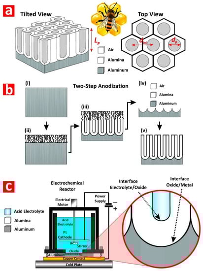 Nanoporous anodic alumina (NAA) is a thin film composed of a matrix of alumina (aluminum oxide—Al2O3) featuring arrays of straight cylindrical nanopores with closed hemispherical bottom tips that grow at the center of hexagonal cells normally aligned to the underlying aluminum substrate (Figure 2a) []. Under specific fabrication conditions, the nanopores of NAA self-organize in a hexagonal fashion, leading to a characteristic honeycomb-like nanoporous structure with tuneable geometric features. NAA is produced by electrochemical oxidation of aluminum substrates in different mild acid electrolytes, the most representative of which are oxalic, sulfuric, and phosphoric acids [,,]. This electrochemical process, so-called ‘anodization’, has been extensively and intensively used in metal finishing industry for more than a century. For example, anodization is used to modify the properties of valve metal parts and structures such as corrosion protection, adhesion, color and appearance, hardness, and impact and erosion resistance. However, despite its intensive use in industry, anodization of aluminum only gained significant attention in nanotechnology after the milestone works of Masuda and coworkers in the mid-1990s, with the introduction of the self-ordered NAA and the two-step anodization process [,,]. These seminal works boosted an increasing and dynamic research activity in this field, spreading the applicability of these nanomaterials across disciplines and fields.