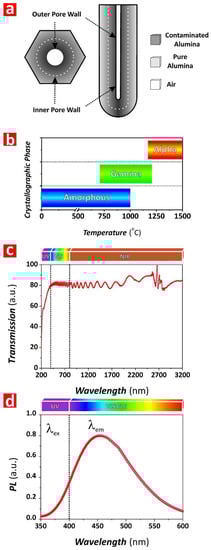 Physical properties of nanoporous anodic alumina (NAA). (a) Onion-like chemical structure of NAA with impurities distribution around the central nanopore. (b) Crystallographic phases of NAA as a function of temperature. (c) Representative UV-visible-near-infrared (NIR) transmission spectrum of NAA (note: NAA produced by two-step anodization under MA regime in oxalic acid electrolyte). (d) Representative photoluminescence spectrum of NAA (note: NAA produced by two-step anodization under MA regime in oxalic acid electrolyte).