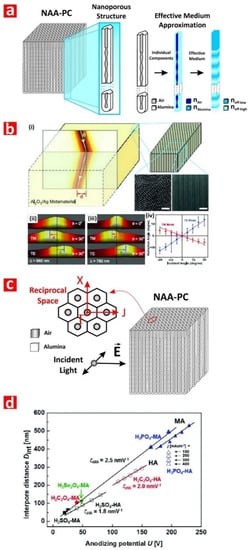 Pioneering studies on NAA-PCs focused on analysis of light–matter interactions in NAA-PC platforms featuring hexagonally arranged straight cylindrical nanopores from top to bottom produced by a combination of nanoimprint lithography and one-step anodization or self-organized NAA-PCs produced by two-step anodization [,,,]. Light in these NAA-PCs is modulated when photons flow transversally across the composite matrix of alumina featuring cylindrical nanopores filled with air (Figure 5c). The seminal studies by Masuda and coworkers and Gösele and coworkers revealed that organized NAA-PCs feature a characteristic photonic stopband (PSB) in their optical spectrum, the position of which can be finely tuned by the interpore distance (i.e., lattice constant—distance between the center of adjacent nanopores) and porosity (i.e., pore diameter) of the NAA-PC platform. During the last decade, intensive research activity has aimed at extending the self-organization regime of NAA toward longer interpore distances (i.e., from 60 to 700 nm) by using different acid electrolytes (e.g., sulfuric, oxalic, selenic, malonic, phosphoric, phosphonic, tartaric, citric, phosphonoacetic, etidronic, etc.) [,,,,,,,,,,,,,,] (Figure 5d). However, the versatility of these PCs to control light across the spectral regions is constrained by the range of available interpore distances. It is worth noting that the photonic band structure of NAA raising from its nanopore periodicity has yet to be utilized in optical sensing applications. Pulse-like anodization approaches have overcome this limitation by enabling the in-depth and multidimensional engineering of the NAA’s effective medium through structural engineering, paving the way for NAA-PC structures with controllable photonic features across the spectral regions.