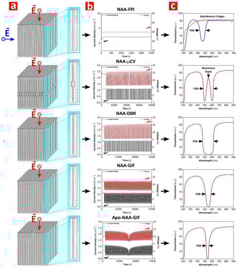 Characteristic nanoporous geometry, anodization profile, and optical properties of representative nanoporous anodic alumina photonic crystals (NAA-PCs) (from top to bottom: NAA-FPI—NAA Fabry–Pérot interferometer; NAA-μCV—NAA optical microcavity; NAA-DBR—NAA distributed Bragg reflector; NAA-GIF—NAA gradient-index filter; Apo-NAA-GIF—apodized NAA gradient-index filter). (a) Schematic showing details of the nanoporous structure of NAA-PCs where indicates the direction of the electromagnetic field. (b) Representative experimental anodization profiles used to produce NAA-PCs. (c) Illustration of optical transmission spectra showing the characteristic photonic features of NAA-PCs.