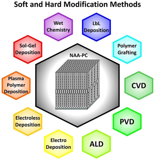 NAA-PCs have an onion-like layered structure consisting of two main layers: an inner layer away from the central nanopore at the aluminum-alumina interface and an outer layer close to the central nanopores located between the inner layer and the alumina-electrolyte interface (Figure 3a) []. The major constituent of the inner layer is pure alumina (Al2O3), whereas the outer layer contains anionic contaminants incorporated from the acid electrolyte during anodization such as sulfate, oxalate, and phosphate []. Some studies reveal the presence of more than two chemical layers in NAA-PCs. Yamamoto et al. identified three layers in NAA, as suggested by the PL spectrum of NAA after discontinuous pore-widening steps []. Santos et al. identified four layers in the chemical structure of NAA with an increasing concentration of impurities toward the layer near the central nanopore by real-time monitoring of pore-widening of NAA using reflectometric interference spectroscopy []. During anodization, heterolytic dissociation of water molecules occurs at the oxide-electrolyte interface, leading to the generation of hydroxyl groups on inner surface of NAA-PCs []. The presence of hydroxyl groups on the inner surface of NAA-PCs allows surface modifications by binding different functional molecules with desirable functionalities for specific sensing applications []. A number of different surface modification methodologies is still available and these can be categorized into soft and hard techniques (Figure 7) [].