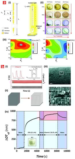 Examples of applicability of NAA-PCs in chemo- and biosensing applications. (a) (i) Schematic showing details of the structure of Nanoporous anodic alumina-distributed Bragg reflectors (NAA-DBRs) produced by STPA, (ii) digital pictures showing the interferometric colors displayed by these NAA-PCs, and (iii) sensitivity and low limit of detection as a function of the fabrication parameters. Reproduced from [], with copyright permission from American Chemical Society, 2015. (b) (i) STPA profile used to produce NAA-DBRs, (ii) schematic showing the fabrication of NAA-DBRs by STPA, (iii) SEM images of NAA-DBRs, and (iv) real-time effective optical thickness change for each sensing stage of vitamin C. Reproduced from [], with copyright permission from American Chemical Society, 2015.