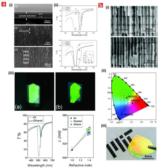 Examples of applicability of NAA-PCs in chemo- and biosensing applications. (a) (i) SEM images of NAA-DBRs, (ii) transmission spectra of NAA-DBRs as a function of the fabrication conditions, and (iii) interferometric colors, transmission spectra, and position of the PSB for different media filling, Reproduced from [], with copyright permission from American Chemical Society, 2008. (b) (i) SEM images of NAA-DBRs, (ii) position within the CIE color space, and (iii) digital images showing the interferometric color of NAA-DBRs at different fabrication conditions. Reproduced from [], with copyright permission from American Chemical Society, 2018.