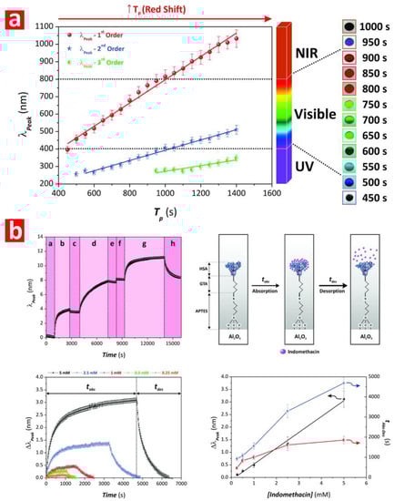 Santos et al. developed an optical sensing system combining protein-modified NAA-GIFs and RIfS to assess the pharmacokinetic profile of drugs (Figure 10a,b) []. NAA-GIFs were fabricated by sinusoidal pulse anodization under galvanostatic conditions using sulfuric acid as an electrolyte. These NAA-PCs were chemically functionalized with silane molecules and human serum albumin (HSA) molecules were immobilized onto the surface of APTES-modified NAA-GIFs via glutaraldehyde activation. HSA-modified NAA-GIFs were exposed to indomethacin, a model drug, and the binding events occurring between immobilized HSA molecules and free indomethacin molecules were monitored in real-time by RIfS. The position of characteristic PSB of HSA-modified NAA-GIFs was found to red-shift when these PC platforms were exposed to different concentrations of indomethacin. A linear correlation between spectral shift and concentration of drug was used to establish the sensing performance of this system, with results: S = 0.63 nm mM−1, LLoD = 0.065 mM, and R2 = 0.9935. This study demonstrated the applicability of the proposed system for pharmacokinetic assessment of drug–protein interactions. In an extension of this study, Nemati et al. assessed systematically the binding affinity between a set of drug molecules and HSA using optimized NAA-GIFs as sensing platforms and RIfS []. Spectral shifts in the characteristic PSB and changes in the effective optical thickness of HSA-functionalized NAA-GIFs upon exposure to various drug molecules (i.e., sulfadymethoxine, coumarin, warfarin, indomethacin, and salicylic acid) were assessed as a function of the concentration of model drug. The affinity between HSA-modified NAA-GIFs and drug molecules, defined by the slope of the linear fitting between the sensing parameter and the concentration of drug, was found to be dependent on the sensing parameter used (i.e., PSB shift or effective optical thickness change).