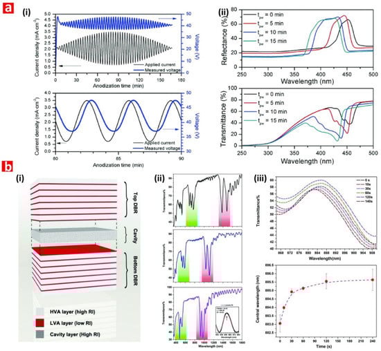 Examples of applicability of NAA-PCs in chemo- and biosensing applications. (a) (i) SPA profile used to produce NAA-GIFs and (ii) reflection and transmission spectra of NAA-GIFs as a function of the pore-widening time. Reproduced with permission from authors of a previous paper []. Copyright Springer, 2014. (b) (i) Schematic showing the structure of NAA-μCVs with two NAA-DBR mirrors and a layer of constant porosity in between, (ii) transmission spectrum of NAA-μCVs showing how the resonance band blue-shifts with the pore-widening time, and (iii) detection of humidity level based on red shifts in the resonance band of NAA-μCVs. Reproduced from [], with copyright permission from American Chemical Society, 2015.