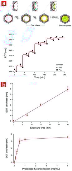 The selectivity, affinity, and specificity of gelatin-modified NAA-FPIs toward trypsin were verified by exposing a set of these PC platforms to nonspecific enzymes (i.e., chymotrypsin and horseradish peroxidase) as well as hemoglobin-modified NAA-PFIs to trypsin. The digestion of gelatin immobilized on the inner surface of NAA by trypsin enzyme was quantified by ∆OTeff as a function of the concentration of trypsin. This enzymatic sensor achieved a sensitivity of −106.9 nm (mg mL−1)−1, a LLoD of 0.025 mg mL−1, and a R2 of 0.9140. This system enabled the quantification of the kinetics of gelatin digestion (i.e., Michaelis–Menten parameters) by the reaction velocity, defined by ∆OTeff and reaction time and the concentration of gelatin. Krismastuti et al. developed an enzymatic sensor combining NAA-FPIs and RIfS to detect levels of proteinase K (Figure 13a,b) []. The surface chemistry of NAA-FPIs was modified with polyelectrolytes by the LbL deposition technique. The enzymatic degradation of the LbL layers by proteinase K was characterized by ∆OTeff as a function of exposure time and concentration of proteinase K. The sensitivity of the enzymatic sensor was 12.311 nm (mg mL−1)−1 with a LLoD of 0.06 mg mL−1. This sensor was also able to detect the presence of proteinase K in human wound fluid, demonstrating the potential of this system for detection of bacterial infections in chronic wounds.