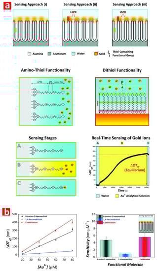 Kumeria et al. presented an ultrasensitive NAA-FPI sensor to detect Au3+ ions in aqueous matrices using RIfS []. Chemical selectivity was attained by functionalizing the inner surface of NAA-FPIs with 3-mercaptopropyl-triethoxysilane (MPTES), which contain a thiol functional group with high affinity toward gold (III) ions. Interactions between gold ions and thiol functional groups induced ∆OTeff, the magnitude of which was found to be dependent on the concentration of Au3+. The proposed sensor had a working range from 0.1 to 80 μM with a sensitivity of 1.09 nm μM−1 and a LLoD of 0.1 μM. The chemical selectivity of the system toward Au3+ was verified through a series of selectivity tests with solutions containing potential interfering ions. Furthermore, the system’s performance for real-life applications was demonstrated by detecting Au3+ in tap water and phosphate buffer solution. An interferometric sensor based on the combination of gelatin-functionalized NAA-FPIs and RIfS was developed by Nemati et al. for the selective detection of trypsin enzyme (Figure 12a,b) [].