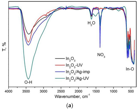 IR spectroscopy was used to study the functional groups on the surface. The IR spectra of In2O3 samples and In2O3/Ag nanocomposites are compared in Figure 8a. The absorption bands at 400–650 cm−1 correspond to In–O oscillations in the In2O3 crystal lattice. The spectra indicate that nitrate groups (1385 cm−1), adsorbed water (1625 cm−1), and hydroxyl groups (3000–3650 cm−1) are present on the surface. Samples In2O3-UV and In2O3/Ag-UV contain a smaller amount of nitrate groups due to their photoreduction under UV radiation. Modification with silver leads to an increase in the concentration of surface hydroxyl groups compared with unmodified In2O3, both using the impregnation method and the UV treatment in an aqueous medium. The largest effect occurs when silver is introduced under the UV treatment. This can be due to photodesorption of oxygen and subsequent dissociative adsorption of water molecules at the corresponding adsorption sites. A similar effect of surface hydroxylation under UV radiation is described in the literature for In2O3 nanowires and other semiconductor oxides ZnO, TiO2, V2O5, WO3 [39,40,41,42,43,44].