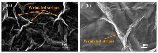 Some GO sheets were dispersed in 100 mL of deionized water to produce GO suspensions. Before the drop-casting of GO suspensions at a concentration of 1 mg/mL, the SiO2/Si substrates were cleaned through sonication in acetone (CH3CO), deionized water, and isopropanol (C3H8O) sequentially to remove the olein that adhered to the substrate surfaces. To increase the hydrophilicity of the SiO2/Si substrates, clean and dry pressurized air was converted to plasma and used to clean each substrate surface for 30 s. GO suspensions were perpendicularly drop-cast on the SiO2/Si wafer substrates, producing GO films on the substrates. Then, GO films were dried at room temperature for 48 h. Because GO films do not offer sufficient electrical conductivity, each GO film was coated with a gold thin film that served as a conductive layer for surface morphology measurements using the SEM. Figure 3 presents typical SEM images of a GO film (a) and an rGO film (b) coated on Si substrates. The rGO film was reduced with a working distance of 9 mm and a plasma irradiation time of 120 min and covered with a quartz shelter. Both images were measured at 10,000× magnification. The GO film surface exhibited markedly wrinkled microstripes and nanostripes because the violent oxidizer destroyed the ordered structures of HOPG sheets during the deep-oxide process; therefore, the bond angle of carbon–oxygen bonds was altered, as shown in Figure 3a. After the plasma reduction, the wrinkled stripes on the rGO film surface were markedly decreased, as shown in Figure 3b. Moreover, the surface morphology of rGO films became more bouffant due to the intense plasma-jet interaction.