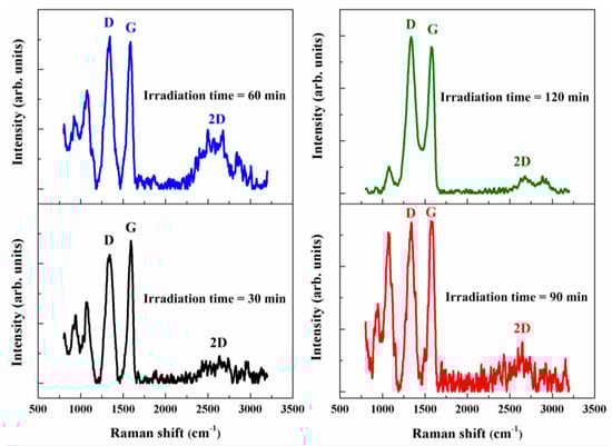 According to the measured results displayed in Figure 5, the intensity of the D band of rGO films with a plasma irradiation time of 120 min was significantly lower than that of other films. This occurred because long plasma irradiation sessions produced large defects that broke the rGO films. The ratios of D/G relative intensity (ID/IG) and 2D/G relative intensity (I2D/IG) were normally used to quantify defects in graphene materials and to qualify the number of stacked graphene layers, respectively. The ID/IG and I2D/IG ratios of GO and rGO films without any shelter for different plasma irradiation times are summarized in Table 2. The average ID/IG ratio of GO films was 0.77. The ID/IG ratios of rGO films were 0.89, 1.08, 0.97, and 1.09 when the plasma irradiation times were 30, 60, 90, and 120 min, respectively. The ID/IG ratios of rGO films were markedly larger than those of GO films because the plasma irradiation produced some material defects. The I2D/IG ratios of rGO films were 0.08, 0.23, 0.19, and 0.05 when the plasma irradiation times were 30, 60, 90, and 120 min, respectively. The measured results of Raman spectra proved that the I2D/IG ratios of rGO films increased with increasing plasma irradiation times ranging from 30 to 60 min. Nevertheless, the peak intensity of the 2D band declined as the plasma irradiation time increased to 120 min. This phenomenon was attributed to the prolonged interaction forces of plasma jets on the GO film surface, which blew out the rGO films and reduced the plasma reduction ability. Nguyen et al. reported that I2D/IG ratios of 2–3, 1–2 and less than 1 represented monolayer, bilayer, and multilayer graphene, respectively [27]. In this study, the I2D/IG ratios of rGO films without any shelter were less than 1; thus, it was estimated that the products had multilayer graphene structures.