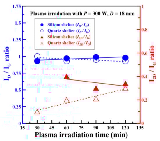 Summary of the ID/IG and I2D/IG ratios of rGO films versus different plasma irradiation times with silicon and quartz shelters.
