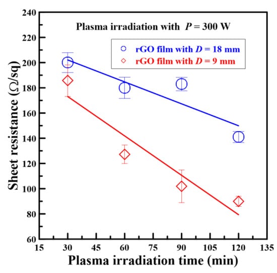 Because the quartz-sheltered rGO films had lower sheet resistance values, to investigate the variety of sheet resistance values, the working distance was changed from 18 mm to 9 mm so that the plasma jets transferred considerable heat onto the film surfaces. Figure 8 shows the sheet resistance values of quartz-sheltered rGO films versus different plasma irradiation times and working distances. The sheet resistance values of quartz-sheltered rGO films were 185.7, 127.3, 101.9, and 90 Ω/sq when the plasma irradiation times were 30, 60, 90, and 120 min. The measured results revealed that the sheet resistance value decreased as the plasma irradiation time increased. Moreover, all sheet resistance values for rGO films fabricated at a working distance of 9 mm were substantially lower than those of ones fabricated at a working distance of 18 mm.