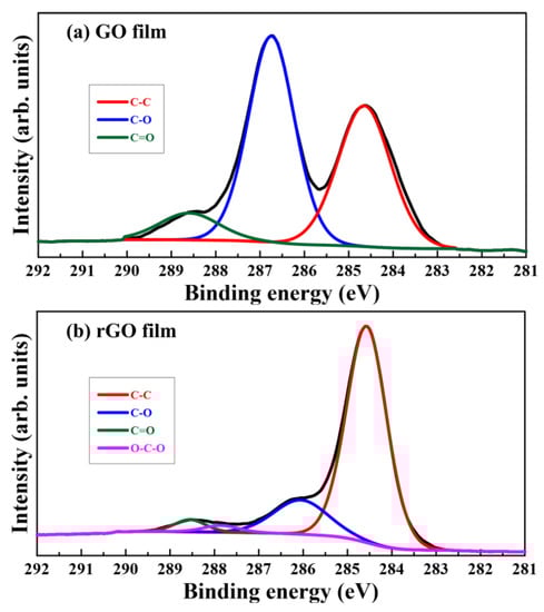 To resolve the issues related to these bond components, C1s XPS spectra of GO films and typical quartz-sheltered rGO films with a working distance of 9 mm and plasma irradiation time of 120 min were deconvoluted in Figure 10a,b, respectively. Figure 10a shows three types of covalently bonded carbon existing in GO films as C–C (284.6 eV), C–O (286.7 eV), and C=O (288.6 eV), respectively. Furthermore, the four types of covalently bonded carbon structures existing in typical rGO films were C–C (284.6 eV), C–O (286.7 eV), C=O (288.6 eV), and O–C–O (287.8 eV), as presented in Figure 10b. A new peak of conjugated O–C–O structures at 287.8 eV appeared in the C1s spectra of typical rGO films. This was attributed to the plasma reduction process with clean dry air, which produced a new bond. Because the GO films had numerous oxygen-containing functional groups, the intensity of the C–O bond peak was clearly higher than that of the C–C bond peak. However, the intensity of the C–O bond peak was markedly lower than that of the C–C bond peak after plasma reduction. This implied that oxygen-containing functional groups of typical rGO films decreased as carbon atoms increased. A comparison of Figure 10a,b indicates that the intensities of the C–O bond peaks in typical rGO films were significantly lower than those in GO films, and the intensities of the C–C bond peaks in typical rGO films were markedly higher than those in GO films.