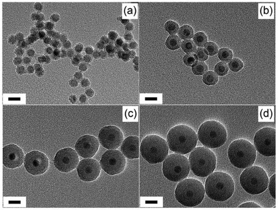 Transmission electron microscope (TEM) image of 12.2-nm Fe3O4@SiO2 nanoparticles (NPs) with shell thicknesses of (a) 2.0 nm, (b) 6.3 nm, (c) 14.1 nm, and (d) 19.8 nm. Scale bar = 20 nm. Reproduced with permission from [65]. Copyright American Chemical Society, 2012.