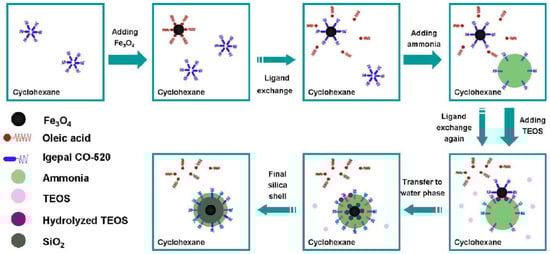 Illustration of the coating mechanism of SiO2 on the Surface of Fe3O4 NPs. Reproduced with permission from [62]. Copyright American Chemical Society, 2012.