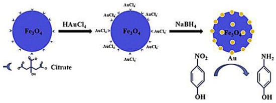 A direct method is to directly form a gold shell onto the surface of IONPs via reduction of Au3+ by using reducing agents. Direct gold coating can be carried out in aqueous or organic solution. In the aqueous phase, the sodium citrate and sodium borohydride are the frequently used reducing agents [116,121]. Ghorbani et al. synthesized the citrate-protected Fe3O4/Au NPs by the method of Lo. First, HAuCl4 was added to deionized water and heated to boiling. After that, the prepared Fe3O4 nanoparticle solution was added, followed by the insertion of sodium citrate under stirring. Finally, the mixture was boiled under stirring for 5 min and in doing so the solution color changed from brown to burgundy [122,123]. Yan et al. synthesized the carboxylate-functionalized Fe3O4 NPs by a one-step method and subsequently mixed it with HAuCl4 aquatic solution. Then added NaBH4 to the mixed solution to directly reduce the HAuCl4. Inspired by the experimental results, they put forward a mechanism to synthesize bifunctional Fe3O4@Au nanocomposites, as shown in Scheme 4. Carboxylic acid groups adsorbed AuCl4 under acidic condition, and then NaBH4 was added to form zero-valent Au which attached to Fe3O4 NPs through the chemistry of the carboxylate group, and gradually the gold shell was formed around Fe3O4 NPs [124]. Hydroxylamine hydrochloride is another reducing agent used [125].