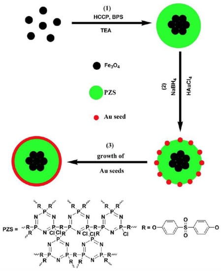 An indirect method is used to synthesize Fe3O4@Au NPs by forming a “glue” layer between the IONPs core and the gold shell. The layer design and preparation are crucial during the synthesis as they can affect the properties of the Fe3O4@Au NPs [128]. The “glue” layer should be capable of enhancing the Fe3O4 MNPs stability, and also have metal binding groups to attach gold seeds to promote the formation of gold shell. Materials used as the “glue” layer are often polymers, silica and carbon [129,130,131,132]. Wang et al. used the mercapto-silica shell as the “glue” layer combining the Fe3O4 core with the Au shell and obtained the durian-like multifunctional Fe3O4@Au nanocomposites [129]. Li et al. synthesized amino-functionalized Fe3O4@SiO2 NPs firstly and then reduced HAuCl4 by a seed growth method to obtain Fe3O4@Au NPs [130]. Polyphosphazene (PZS) as the “glue” layer has been studied. The steps involved in the preparation are shown in the Scheme 5. These synthesized Fe3O4@PZS@Au NPs has multiple functions for MRI and photothermal therapy, as well as the potential to be used as a biosensor and catalyst [131]. Ramos-Tejada et al. developed a new approach to synthesize Fe3O4/Au NPs. The first step involved mixing FeSO4 and distilled water, by adding KNO3 and NaOH in an oxygen-free environment at 90 °C to synthesize Fe3O4 core. The second step involved mixing MNP suspension with polyethylenimine (PEI) solution, by applying sonication to achieve a first PEI layer; subsequently a second poly(styrenesulfonate) (PSS) layer and a third PEI layer were added using a layer-by-layer techniques. The third step involved using NaBH4 to reduce chloroauric acid to obtain negatively charged gold NPs. In a fourth step, the previously obtained polymer-coated NPs were dispersed in water until the particle concentration was 0.25 mg/mL, by adding the resulting suspension dropwise to the gold seed solution, after sonication and subsequent further treatment, Fe3O4/Au NPs were finally obtained [133].