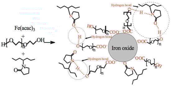Schematic illustration of the synthesis of PEG/PVP-coated superparamagnetic iron oxide nanoparticles (SPIONs). Reproduced with permission from [180]. Copyright Elsevier, 2013.