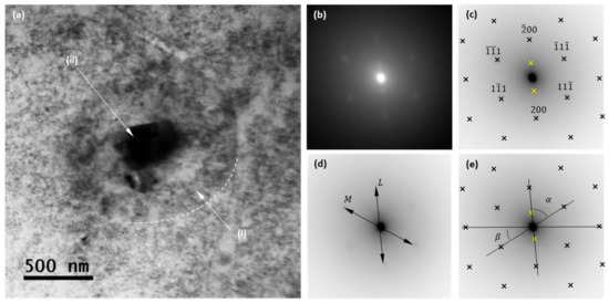(a) Transmission Electron Microscopy (TEM) bright field overview of a single nanoparticle; dark contrast indicates the TiO2 core, while the weaker dark contrast surrounding the nuclei reveals an outer carbon-made shell. (b) Selected area electron diffraction patterns (SAED) obtained in the nanoparticle. Superlattice spots are evidenced. (c) Indexed diffraction pattern, contrast inverted. (d) Definition of the L and M axis, used to calculate the zone axis. (e) Definition of the angles α and 𝛽, used to calculate the zone axis.