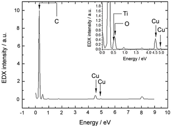 Finally, to corroborate the composition of the nanoparticle, EDX (Energy-dispersive X-ray) spectra were acquired right in the core region. The corresponding spectrum is presented in Figure 4; it presents Ti- and O-related peaks that are labelled and highlighted with dark arrows. Furthermore, a C-related peak reveals the nature of the outer shell of the nanoparticle. The presence of Cu-related peaks is attributed to the Cu-grid of the TEM specimen holder.