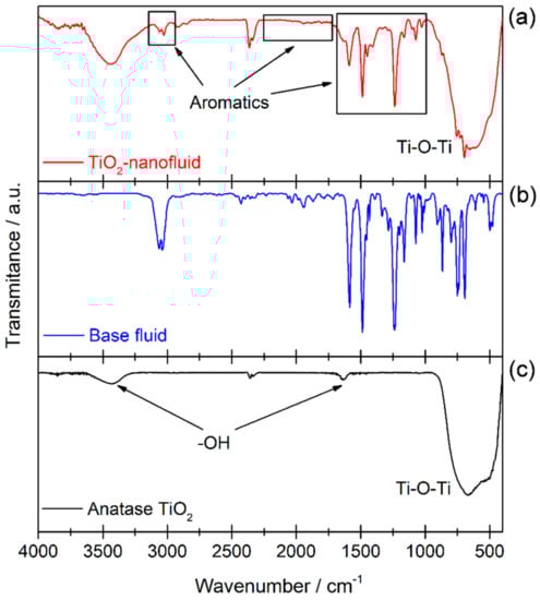 As detailed above, the main aim of this study is the synthesis of TiO2 nanoparticles in a non-polar medium to obtain a nanofluid with good dispersion and a good stability, probably thanks to the presence of phenyl groups surrounding the nanoparticles. Thus, FTIR spectroscopy was used to confirm the presence of TiO2 and other organic species. Figure 5 shows FTIR transmission spectra of the TiO2 sample (a), the base fluid used to prepare the nanofluid (b), and a reference of TiO2 with anatase phase (c) to compare with the nanoparticles formed. A broad band is observed between 1000–400 cm−1, which is the typical zone for the stretching vibration of Ti–O bonds and bending vibration of Ti–O–Ti [28,29]. Also, a broad band can be seen around 3400 cm−1, assigned to OH bonds [29,30]. Furthermore, the FTIR spectrum for the synthesized TiO2 shows the typical peaks for aromatic species (in squares in the spectrum shown in Figure 5a). Comparing it with the spectrum obtained for the base fluid (see Figure 5b), the presence of base fluid molecules is observed, probably around the surface of TiO2 nanoparticles. The adsorption of species onto the surface of the TiO2 could be due to oxygen vacancies, which are known to lead to distortion of the electron clouds in order to balance the charge deficit generated by the vacancy, which generates adsorption centers. In these centers, molecules of the base fluid or benzylic alcohol are probably joined to TiO2 nanoparticles, generating the signals for aromatic bonds on the FTIR spectrum.