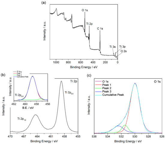 XPS measurements were performed to analyze the oxidation state and the chemical state bonding of the elements composing the sample. Figure 6a shows the general spectrum obtained and the assignation of the peaks found. In detail, Figure 6b shows the Ti 2p signal. The binding energies (BE) for Ti 2p3/2 and Ti 2p1/2 were at 458.6 and 464.4 eV, respectively. These values are consistent with the values reported in the literature for Ti(IV) [31,32]. However, since the two signals were not symmetrical, the Ti 2p3/2 signal was deconvoluted. Two contributions to this signal were found, as is shown in Table 1 and in the inset in Figure 6b. The contribution at 458.7 eV is assigned to Ti(IV), as discussed previously, while the contribution at 457.2 eV is consistent with the values reported for Ti(III) [31,32]. Thus, this result is coherent with the results shown above, because the presence of Ti(III) confirms the presence of oxygen vacancies. Moreover, Figure 6c shows the O 1s signal obtained, which was also observed to be asymmetrical. The deconvolution of this signal showed the presence of three contributions, as Table 1 shows. The contribution at 529.9 eV is assigned to O2− in the TiO2 lattice, as is reported previously [33,34]. Typically, the contributions at higher BE are not easy to assign. In our case, they can be assigned to O atoms of the medium, the diphenyl oxide, and the remains of benzylic alcohol used in the synthesis. The quantitative analysis (see Table 2) showed a higher presence of O with regard to the stoichiometric amount for TiO2, and also more C from the organic compounds used as the medium and as reagents in the synthesis.