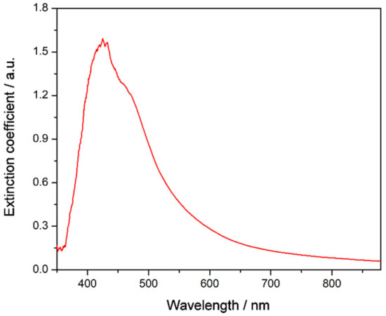 It is crucial to analyze and understand the stability of nanofluids in order to explore their practical applications, as stability plays an important role in their thermal properties. To further verify the effect of the functionalization on the stability of TiO2-based nanofluids, UV-vis spectroscopy, particle size measurements, and ζ potential analysis were performed. Thus, Figure 7 shows the UV-vis spectrum of the nanofluid recorded just after preparation. A wide band is visible between 350 and 600 nm that has been attributed in previous studies to photonic absorption and light scattering processes due to the suspension of nanoparticles [35,36]. Also, no chemical changes were observed in the samples with regard to the base fluid. Moreover, UV-vis spectra were recorded for one month, registering several spectra each day. Thus, Figure 8a shows the extinction coefficient at λ = 550 nm for one month. This wavelength was chosen because the effects of light scattering and photonic absorption related to the concentration of nanoparticles dispersed into the base fluid take place at this wavelength [11], hence the higher the extinction coefficient, the greater the presence of nanoparticles inside the fluid. The extinction coefficient of the nanofluid decreased slightly until the sixth day, after which it remained stable until the thirtieth day after preparation. Therefore, the results showed that the sedimentation and agglomeration processes were reduced and controlled by the preparation of the TiO2-nanofluid using the one-step method.