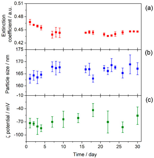 Stability of TiO2-nanofluid measured for 30 days: (a) extinction coefficient at λ = 550 nm, (b) particle size, and (c) ζ potential.