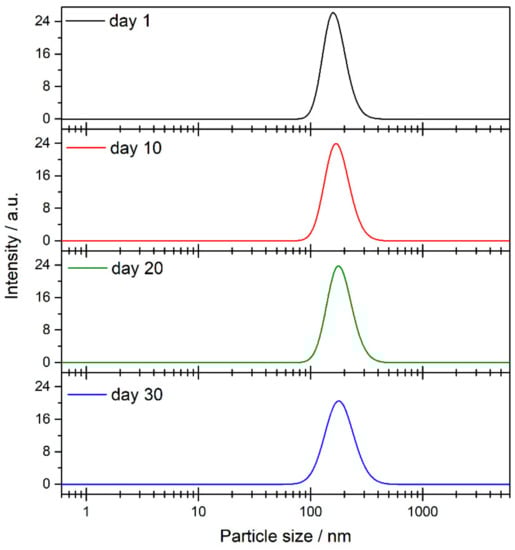 The sedimentation process is closely linked with the size of the agglomerates in the medium. For this reason, nanoparticle size was measured by using the DLS technique. Figure 8b shows the evolution of the particle size in the nanofluid over thirty days. The particle size values vary between 160 and 170 nm for one month, meaning that the TiO2 nanoparticles were highly stable. Agglomeration probably does not occur due to the presence of species from the solvent surrounding the nanoparticles, as is shown from the FTIR results. Also, Figure 9 shows distribution size recorded on specific days. No changes were observed in distribution size; thus, agglomeration did not occur. The magnitude of the ζ potential gives additional information about the potential stability of the colloidal system, as this measures the charge at the slipping plane of the nanoparticle. A highly negative or positive ζ potential implies a strong repulsion between the nanoparticles. Some authors have reported that the stability threshold for colloidal solutions is a |ζ| potential value higher than ±30 mV [37]. Figure 8c shows the ζ potential values for the TiO2-nanofluid measured for one month. The average ζ potential fluctuated between −40 and −80 mV. These results suggest that the surface of the nanoparticles may be covered by a charged layer, which impedes the agglomeration and consequent flocculation of the nanoparticles. Thus, it can be determined that repulsion between nanoparticles prevents the formation of larger particles, as the DLS technique shows. Hence, the nanoparticles are not heavy enough to precipitate because the push force of the fluid is higher than the weight of the nanoparticle. These results are in good agreement with the high stability shown by UV-vis spectroscopy.